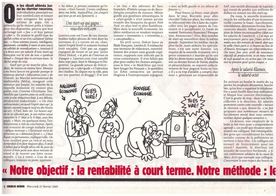 Une petite entreprise du nom de Lanetro employait des cyber rédacteurs pour remplir les pages d'un cyberguide. J'avais 23 ans et j'étais cyber contente d'avoir trouvé un premier emploi. J'avais même arpenté l'appartement de ma grand mère en criant "10 000 FRANCS PAR MOIS !!"